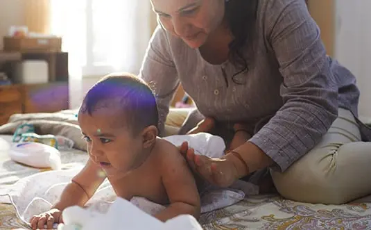 When your baby’s umbilical cord is healed, a gentle massage on the tummy can help with digestion and tummy troubles.